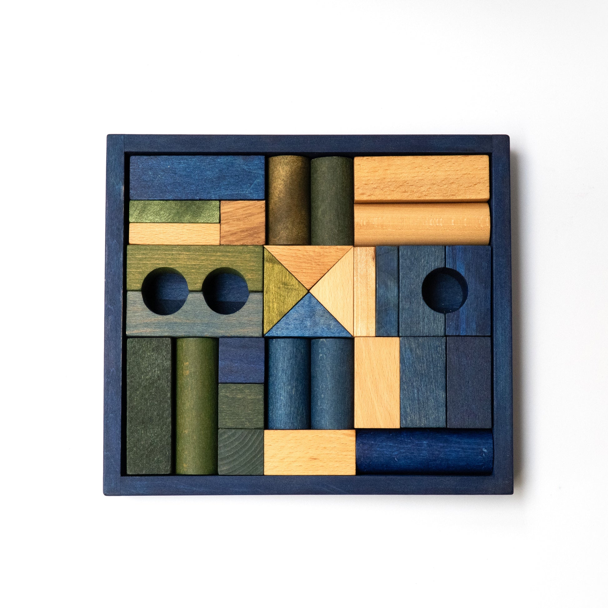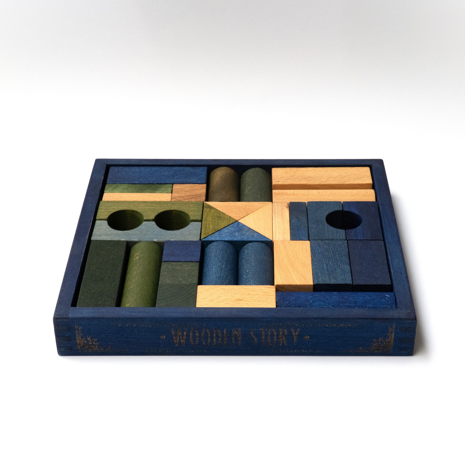 Drewniane klocki kolorowe w barwach zimnych, 30 sztuk w skrzynce z litego drewna w kolorze niebieskim, aby oprócz radości z zabawy, cieszyły nasze oczy tworząc oryginalny element dekoracyjny wnętrza.
