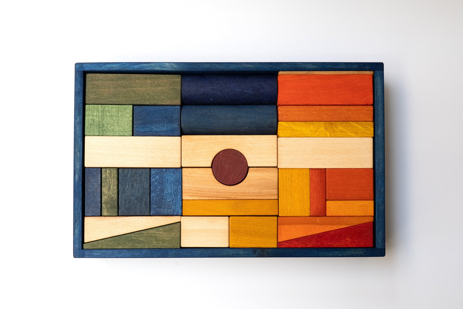 Drewniane klocki kolorowe XL, 63 sztuki w skrzynce z litego drewna w kolorze niebieskim, aby oprócz radości z zabawy, cieszyły nasze oczy tworząc oryginalny element dekoracyjny wnętrza.